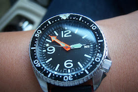 Dial dan jarum pilihan saya untuk modifikasi pertama ini adalah dial model military dengan pengunaan arabic number dan indeks balok. Jarum dibuat 2 warna: putih dan orange. Radium pada dial dan jarum modif ini cukup terang di tempat gelap. Dan ini adalah penampilan akhir Seiko Diver 7002 yang telah bersalin rupa (face-off).