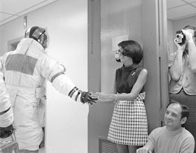 Salam perpisahan astronot Komandan James Lovell sebelum keberangkatan ke ruang angkasa pada project Apollo XIII, 11 April 1970. Omega speedy terlihat dikenakan di lengan sebelah kanannya. I'm leaaaving on a jet plane....and I don't know when I'll be back again...